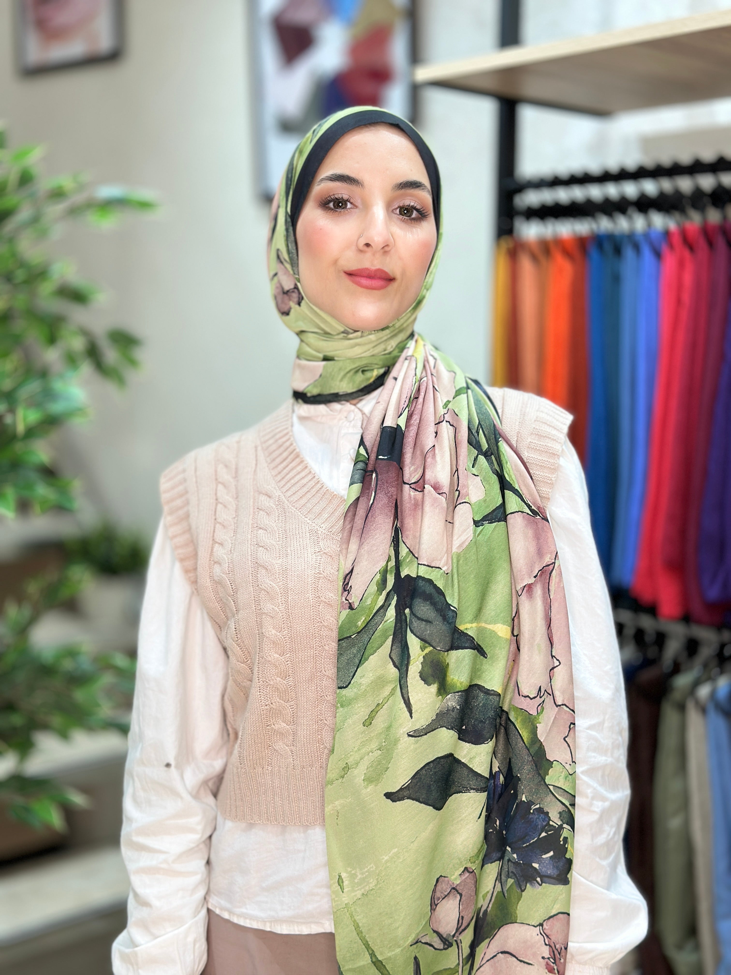 Délicat et expressif, ce châle Hijab Modachic à motif floral abstrait revisite les fleurs à travers une interprétation artistique et contemporaine. Les formes fluides et les nuances subtiles créent un jeu visuel élégant, apportant douceur et caractère à ce foulard au style affirmé.
