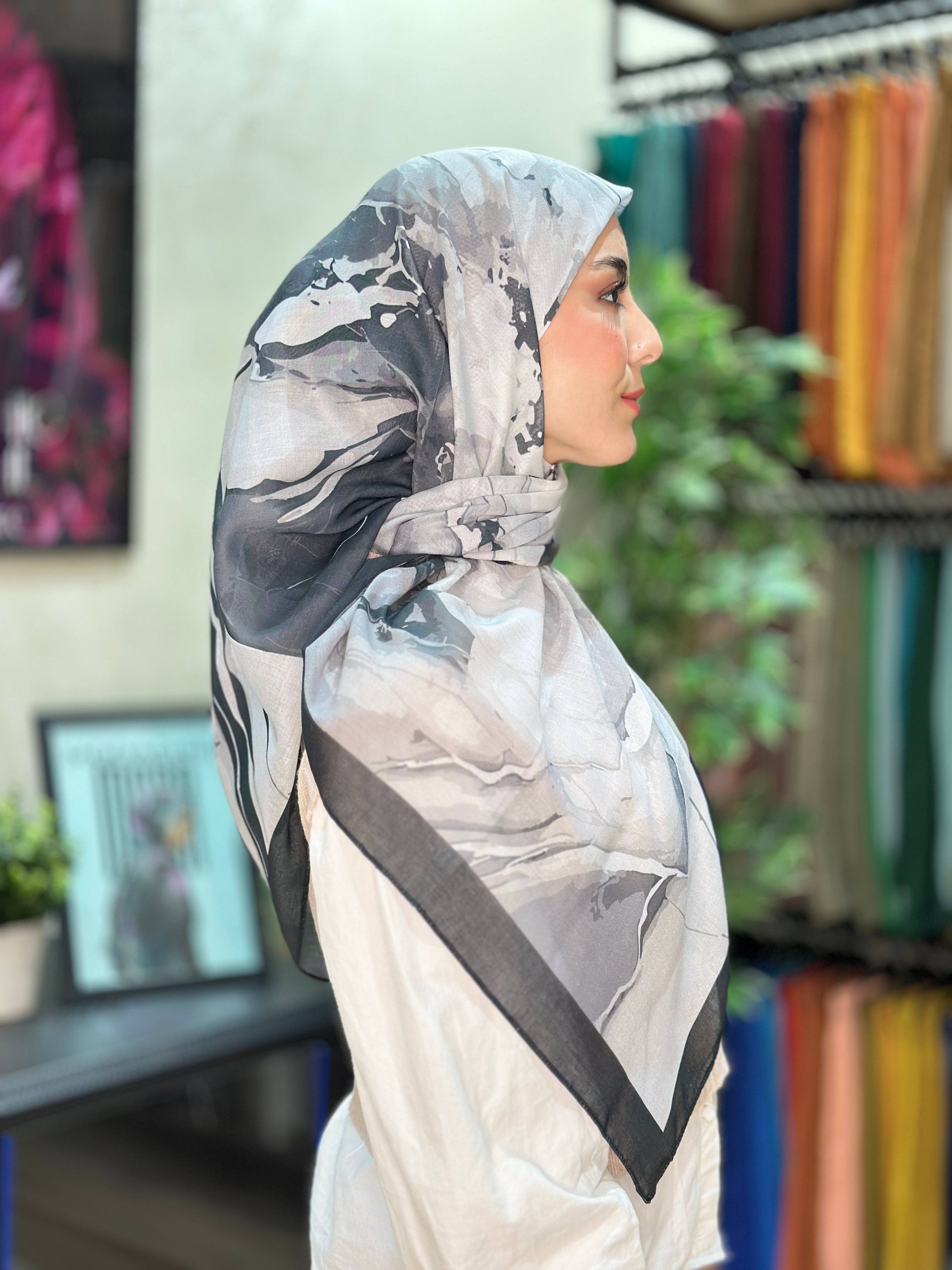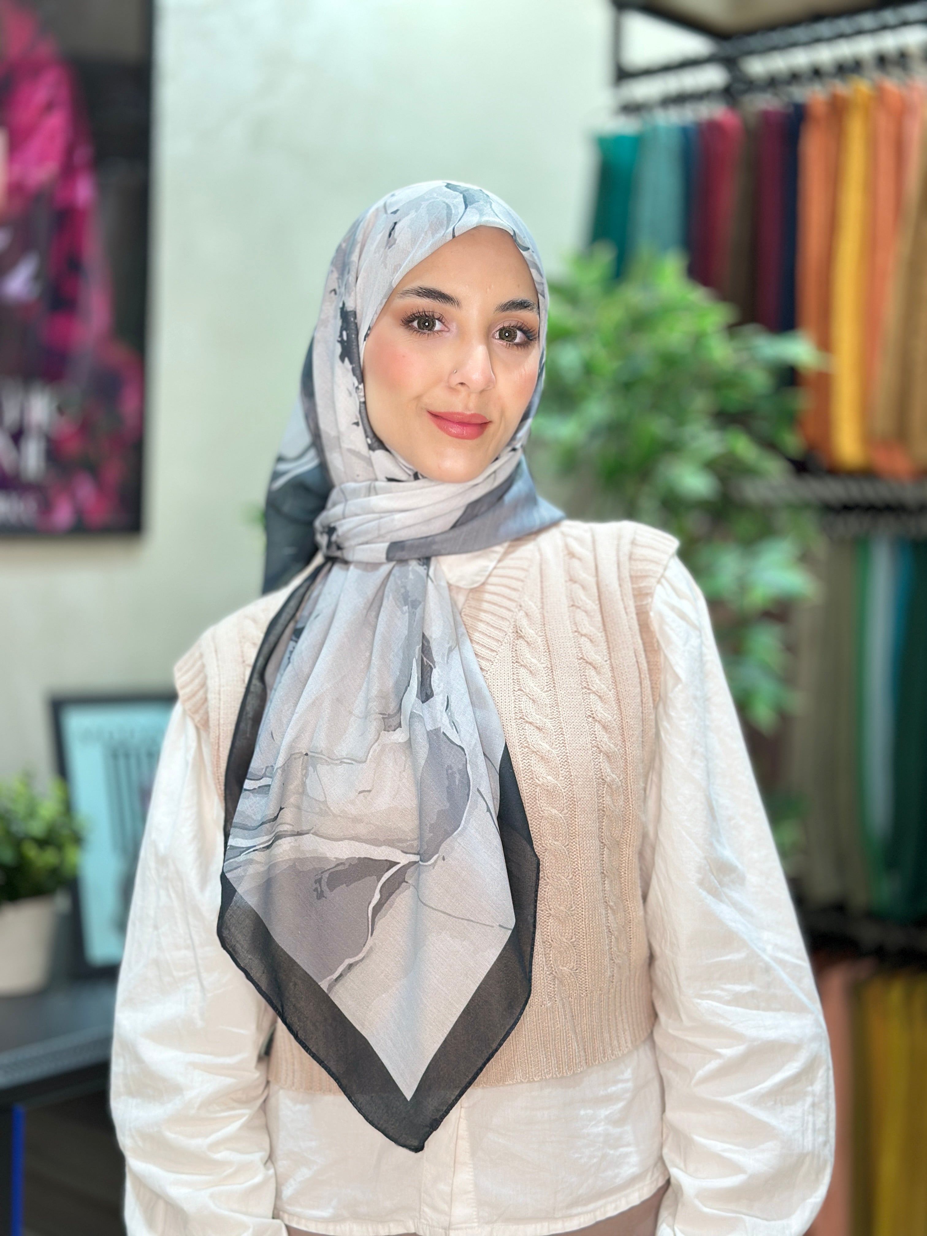 Apportez une touche artistique à votre tenue avec ce foulard carré Hijab Modachic au motif marbre abstrait. Inspiré des formes naturelles et des mouvements fluides, ce foulard se distingue par son design moderne et raffiné. Élégant et polyvalent, il peut être porté comme hijab, châle ou accessoire de style pour sublimer vos looks du quotidien comme ceux des occasions spéciales. Son motif abstrait apporte du caractère tout en conservant une allure chic et intemporelle, faisant de ce foulard Modachic un indispensable du dressing féminin au Maroc.