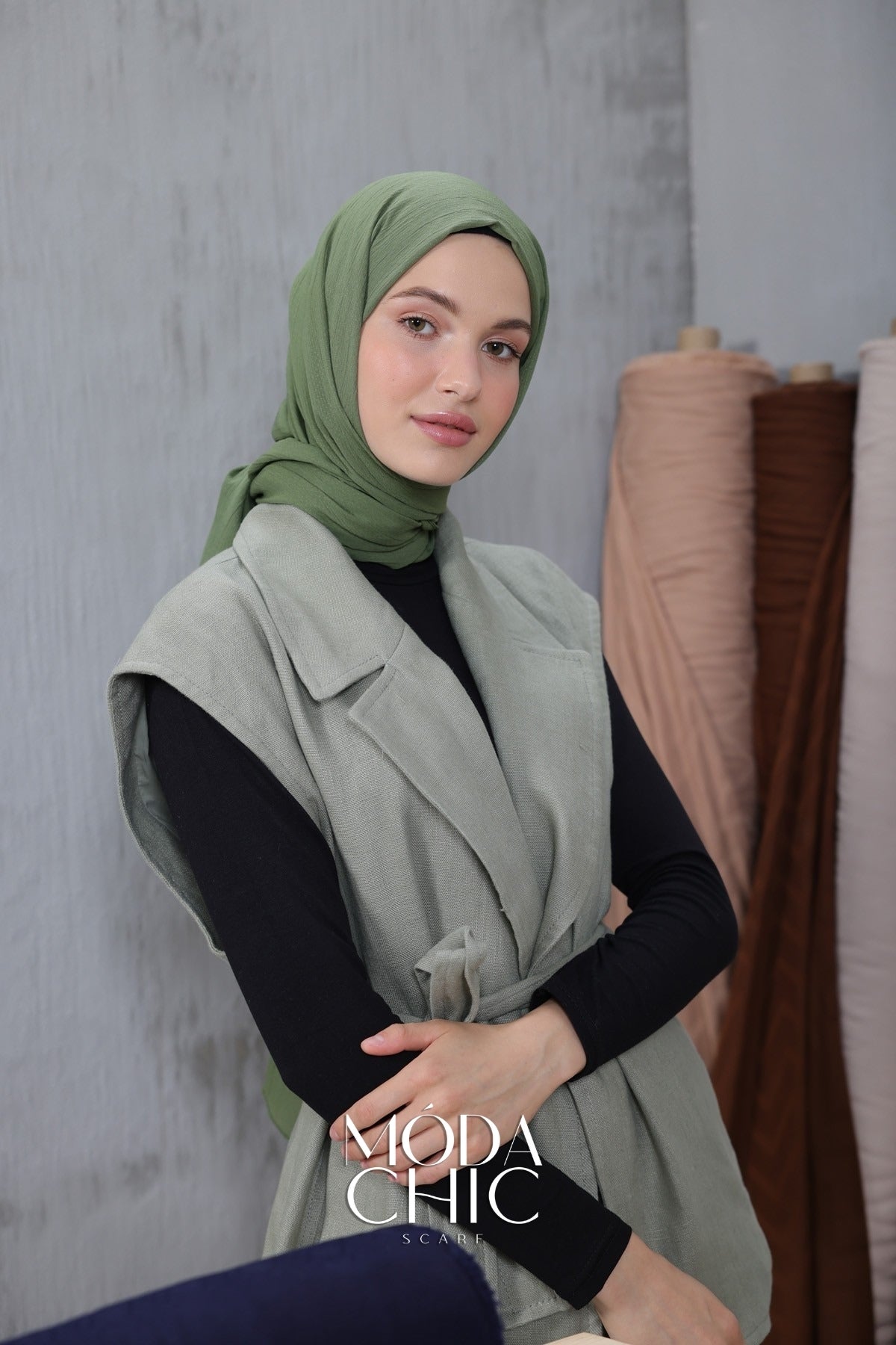 Grâce à la texture créée avec des techniques spéciales de la série Crinkle, elle a un aspect froissé. Sa structure souple lui permet de prendre la forme désirée. Vous pouvez l'utiliser à la fois pour des occasions spéciales et dans votre vie quotidienne. Ses bords sont cousus à l'italienne. Elle ne cause aucun problème de poids ou de glissement. Qu'elle soit utilisée en une seule couche ou en double couche, elle offre une utilisation confortable toute la journée sans plis. Elle ne transparaît pas et peut être utilisée toute l'année.