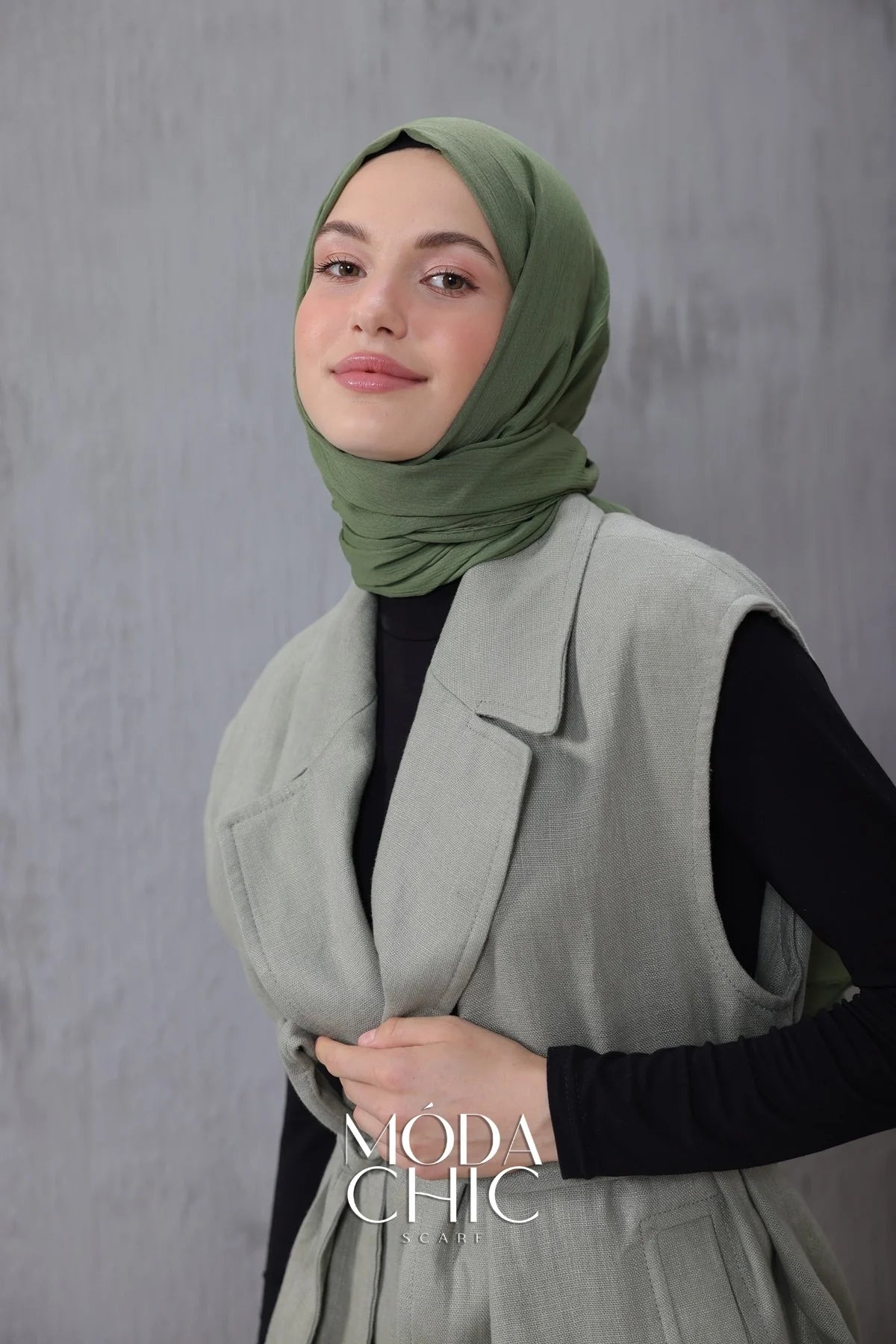 Grâce à la texture créée avec des techniques spéciales de la série Crinkle, elle a un aspect froissé. Sa structure souple lui permet de prendre la forme désirée. Vous pouvez l'utiliser à la fois pour des occasions spéciales et dans votre vie quotidienne. Ses bords sont cousus à l'italienne. Elle ne cause aucun problème de poids ou de glissement. Qu'elle soit utilisée en une seule couche ou en double couche, elle offre une utilisation confortable toute la journée sans plis. Elle ne transparaît pas et peut être utilisée toute l'année.